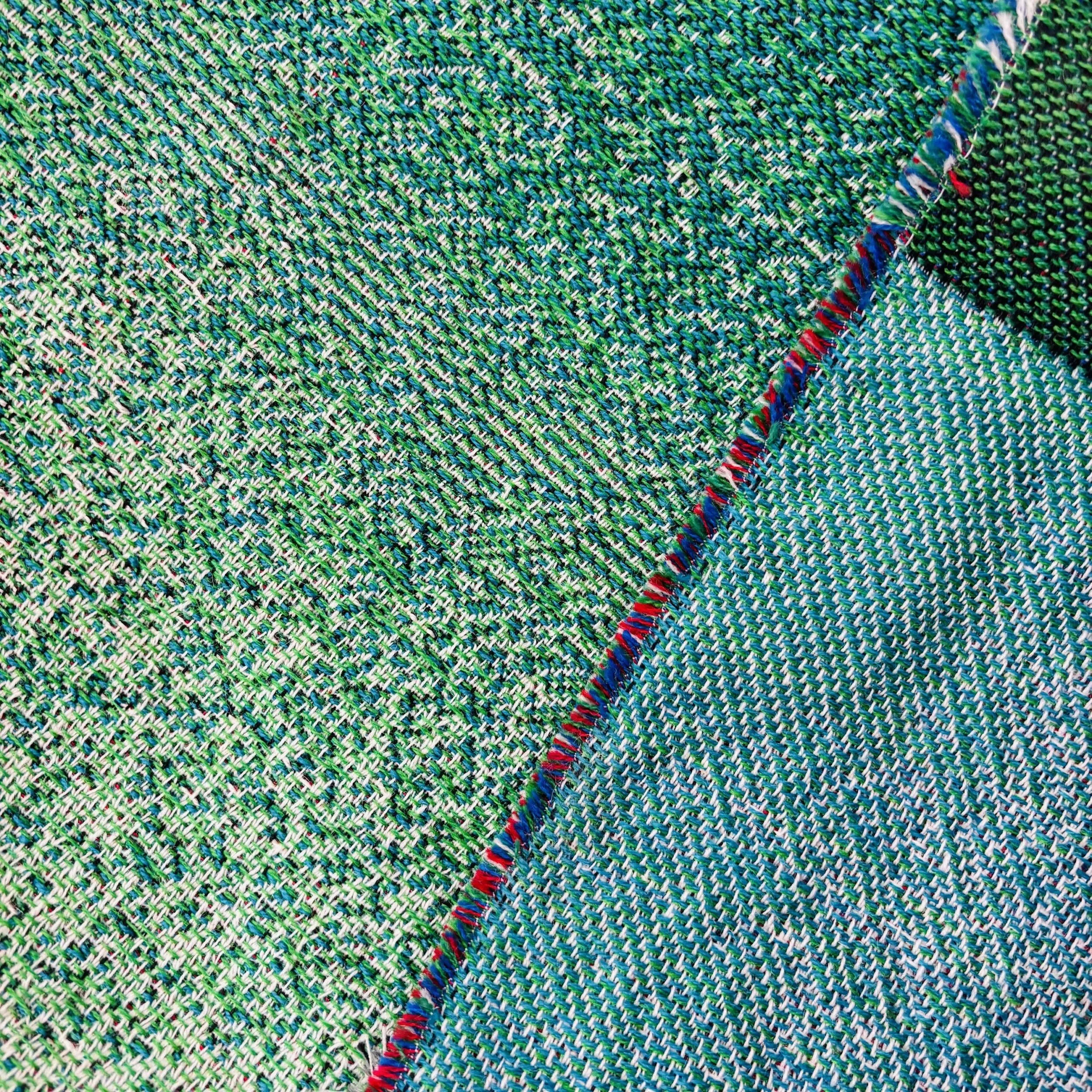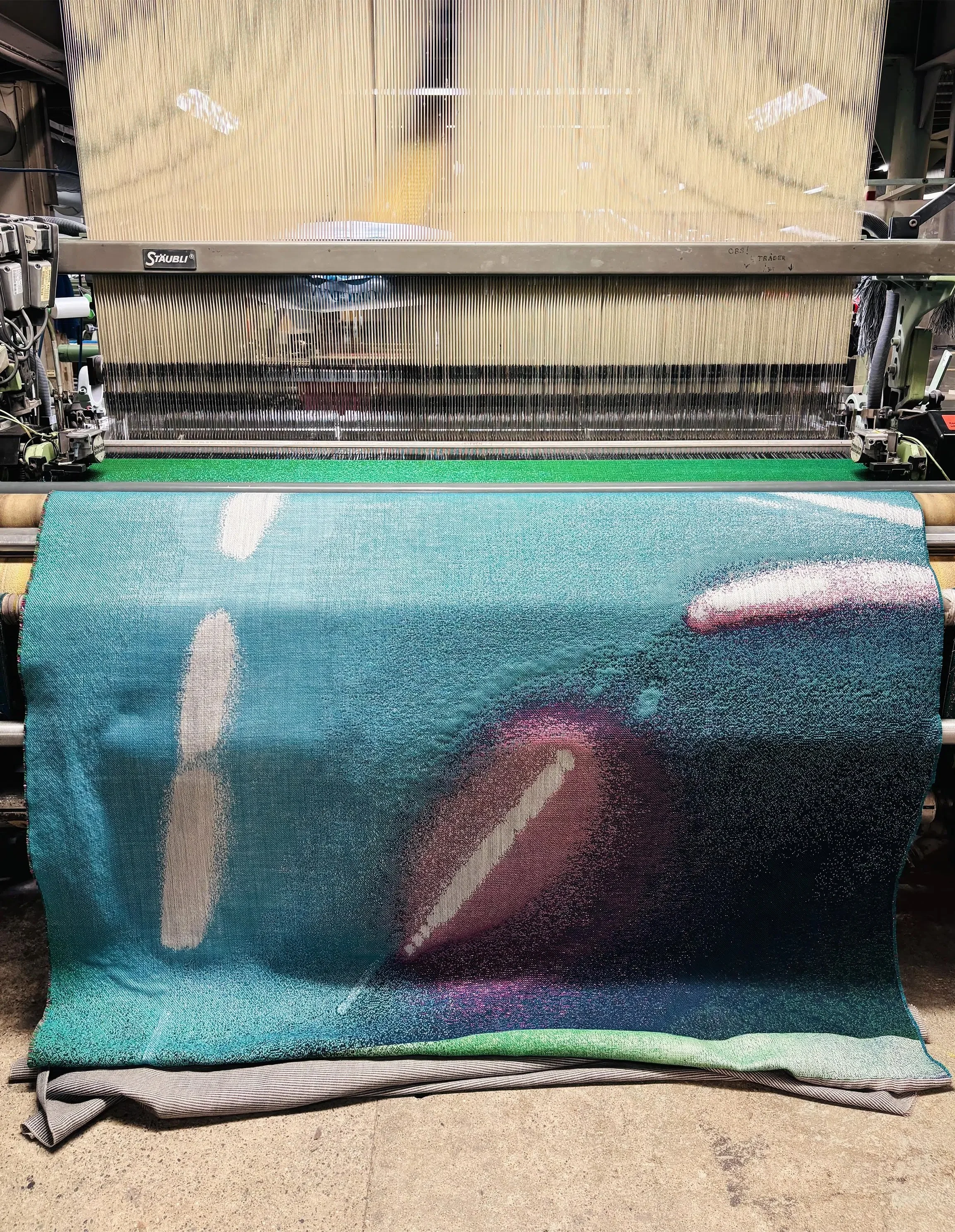 “The installation combines large digital weavings based on CERN’s cloud chamber imagery with a generative algorithm which continuously creates new sequences, merging weather-related excerpts from Frankenstein with historical landscape images and the artist’s own photographs of Lake Geneva, where the novel was written. Atmospheric Omens is thus an invitation to travel across time and scale—from particles to clouds, from 19th-century climate anxieties to future weather scenarios.”
