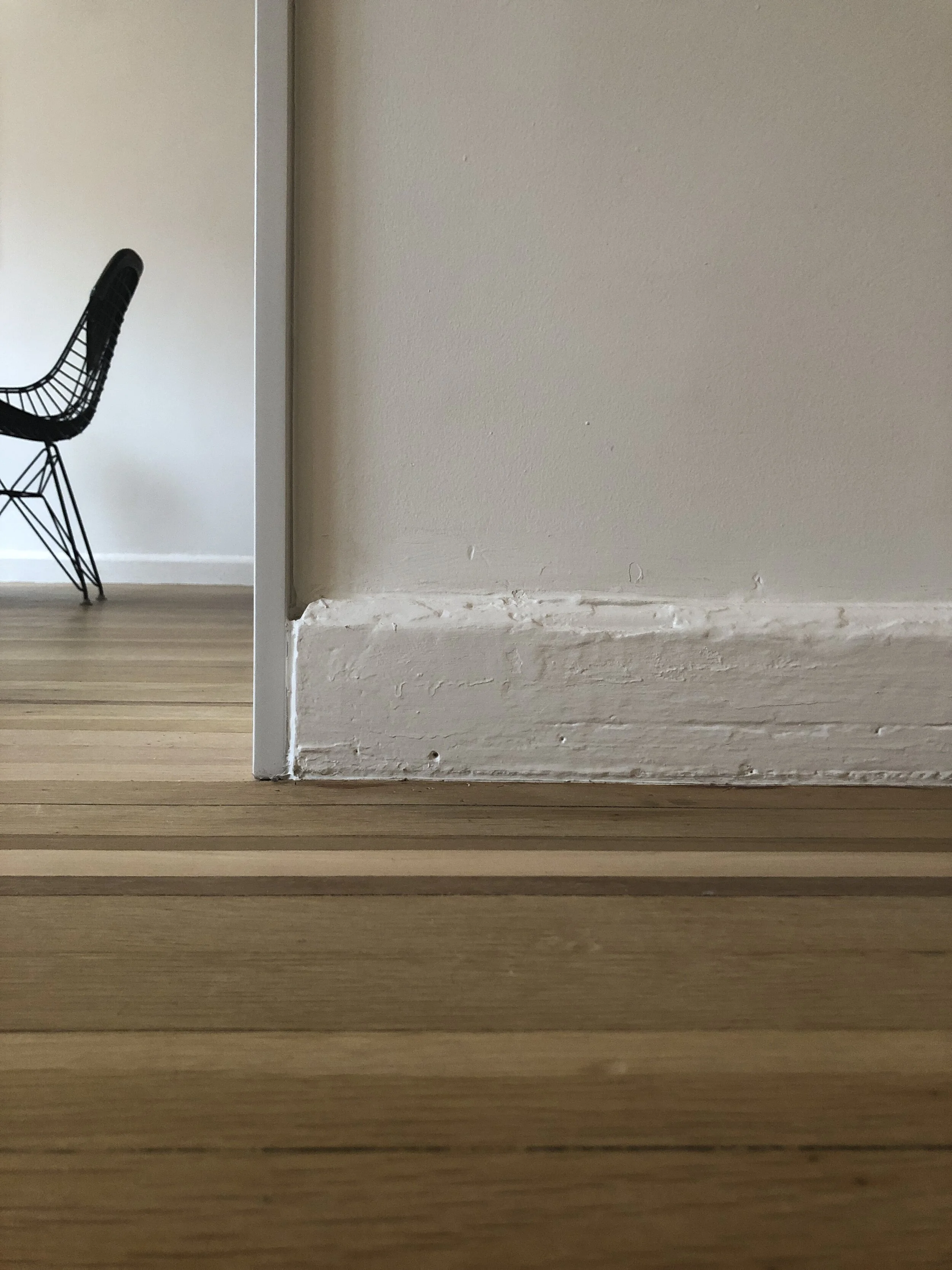 The original floors have been sanded and treated with a matte protective finish. Baseboards, windows frames, doors and their handles - have all been kept, including multiple layers of paint and imperfection.